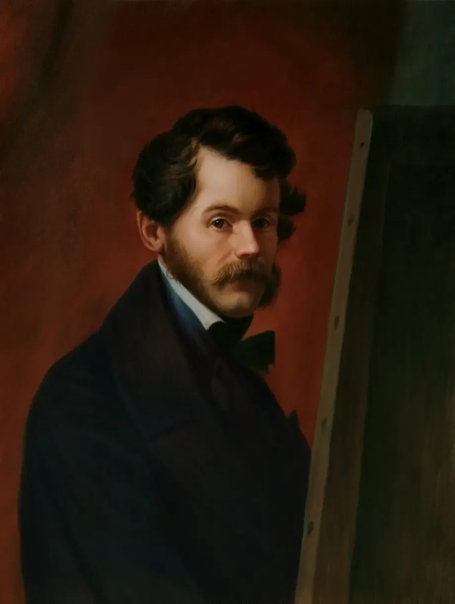 The painting depicts the renowned Austrian painter Franz Xaver Amerling, who was a prominent figure in the Viennese art scene. His work is celebrated for its detailed portraiture and vibrant representation of the human spirit.